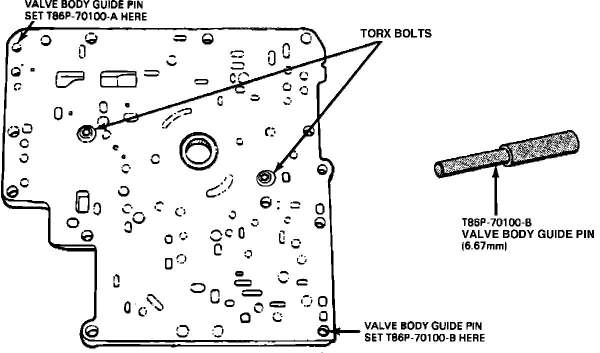 2. Insert valve guide pin T86P-70100-A and valve body guide pin T86P-70100-B as shown in Figure 1.