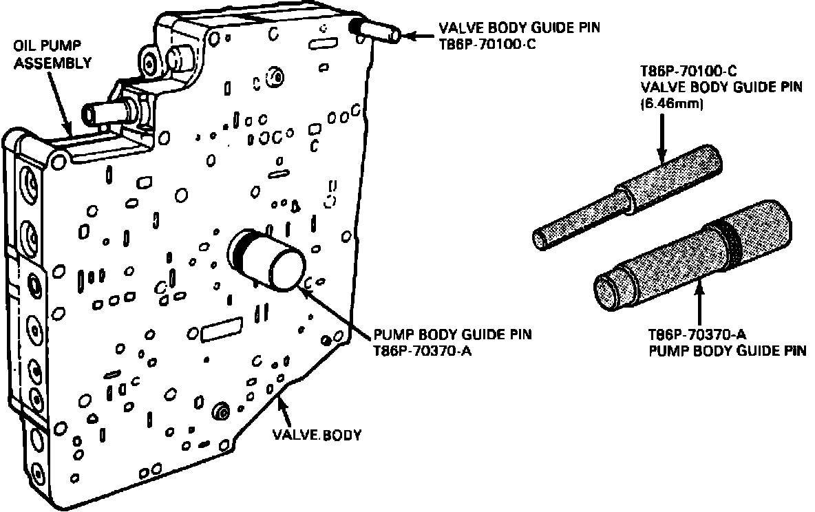9. Insert pump body guide pin T86P-70370-A and valve body guide pin T86P-70100-C as shown in Figure 3.