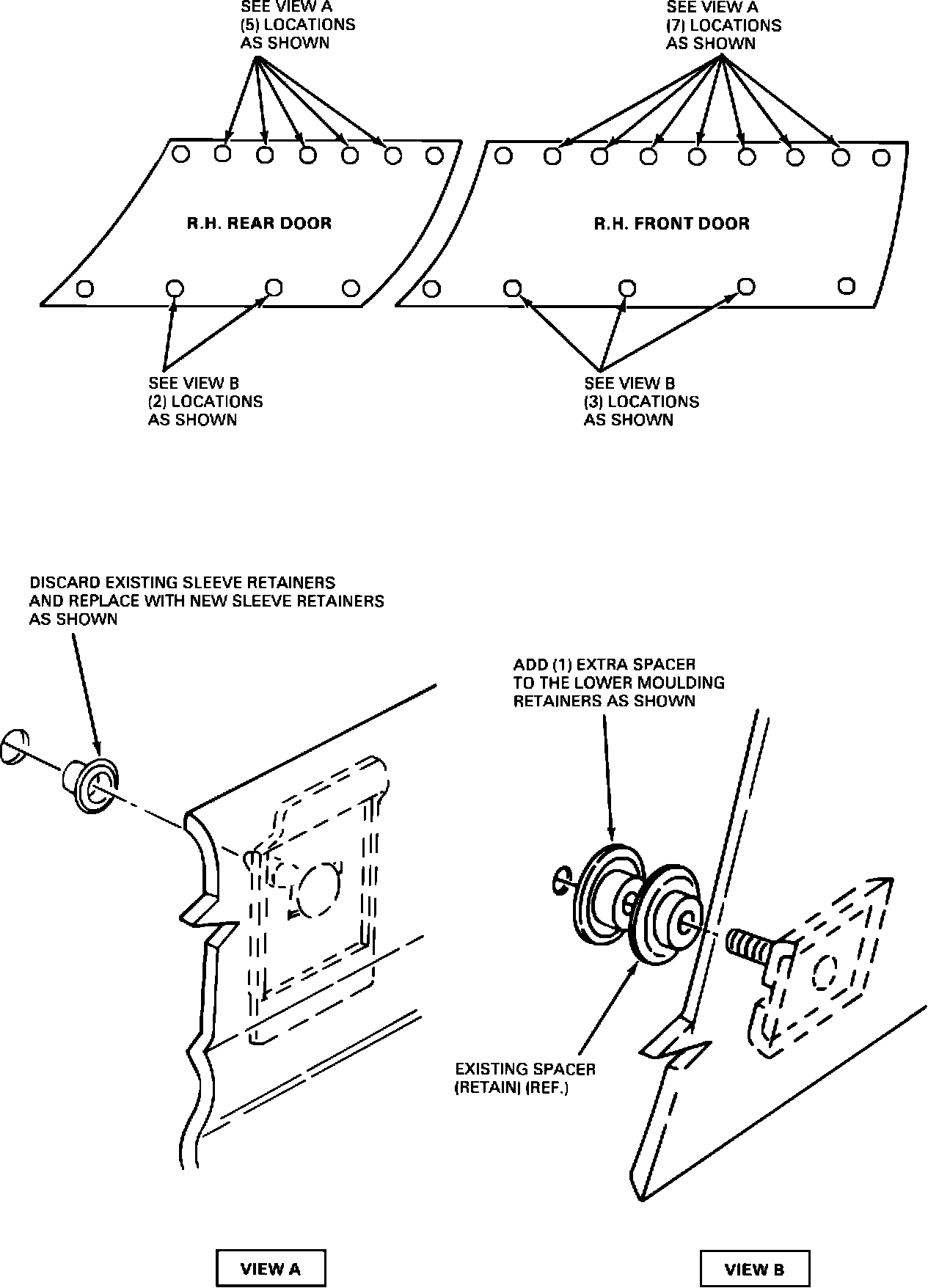4. Install a second spacer washer to the lower moulding retainer locations shown in Figure 1, View B along with the existing one.