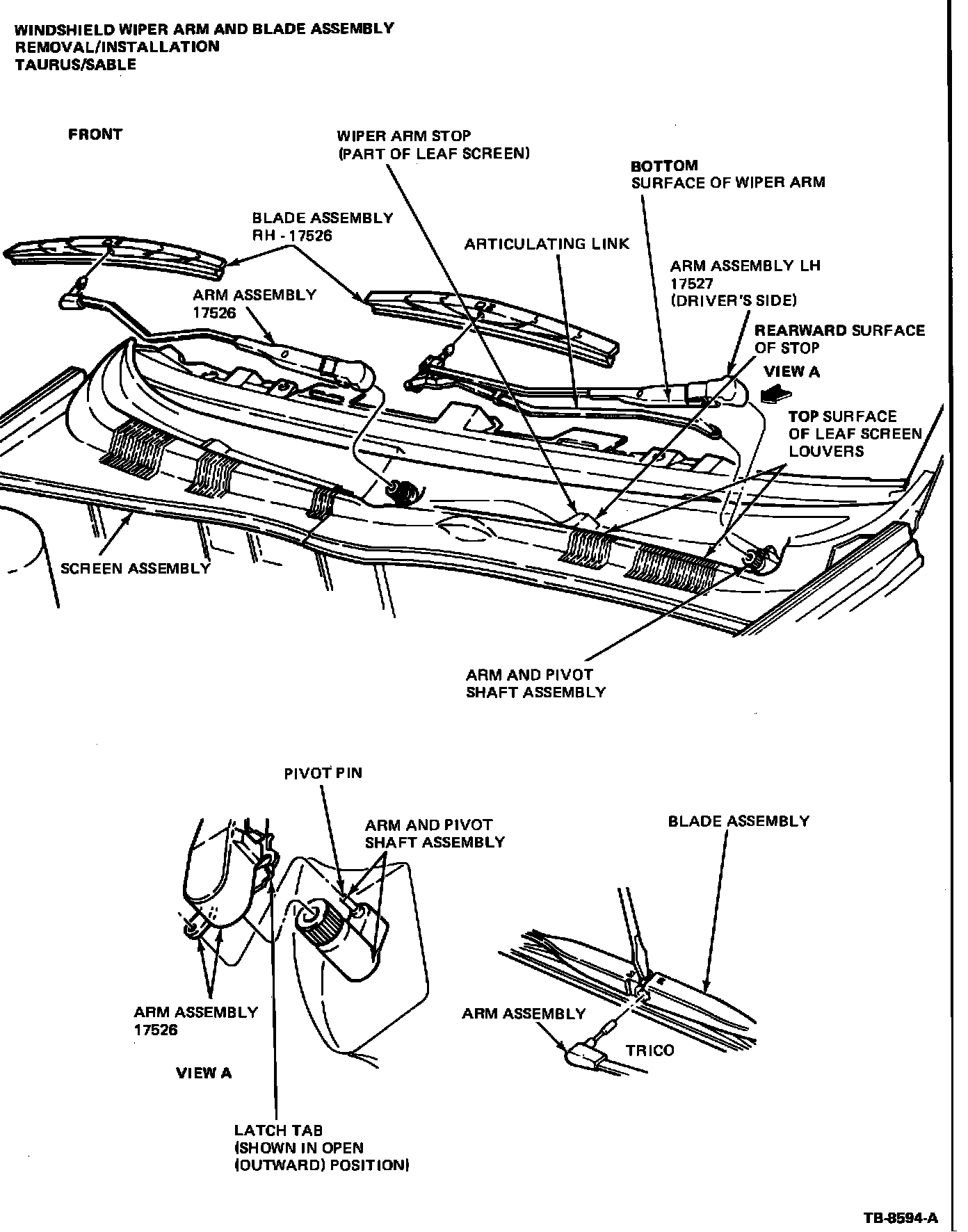 3. To install the (driver's side) windshield wiper arm position the arm's articulating link to the pivot pin and engage onto the pin (see Figure 2, View A).