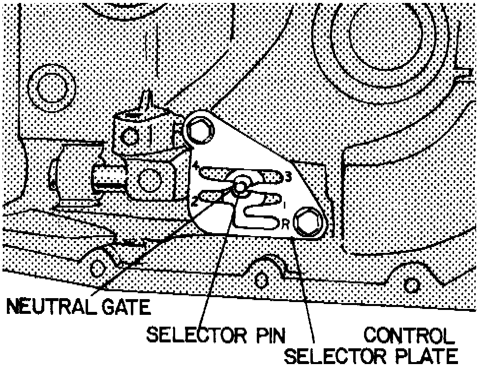 9. Ensure selector pin is positioned in neutral gate of control selector plate and finger of fork selector arm is partially engaged with 1st and 2nd fork an partially engaged with 3rd and 4th fork.