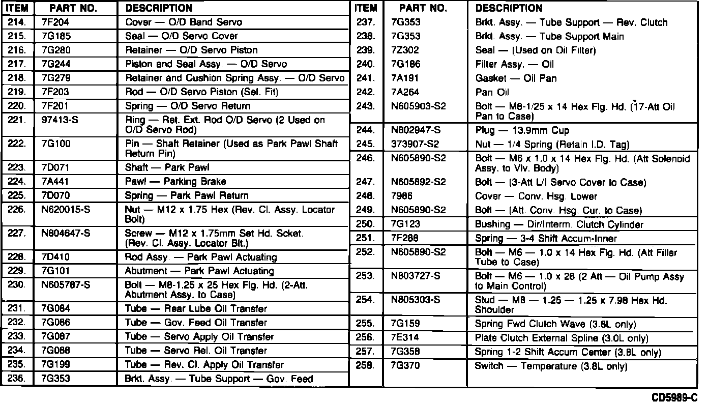 Part No. and Description For Items 214 Thru 258