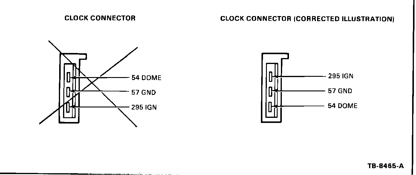 The circuit wiring illustration for the electronic clock in Section 33-15-3 of the 1986 Car Shop Manual, Volume C, is incorrect. The pin callouts have been reversed and could result in incorrect diagnosis of the electronic clock.