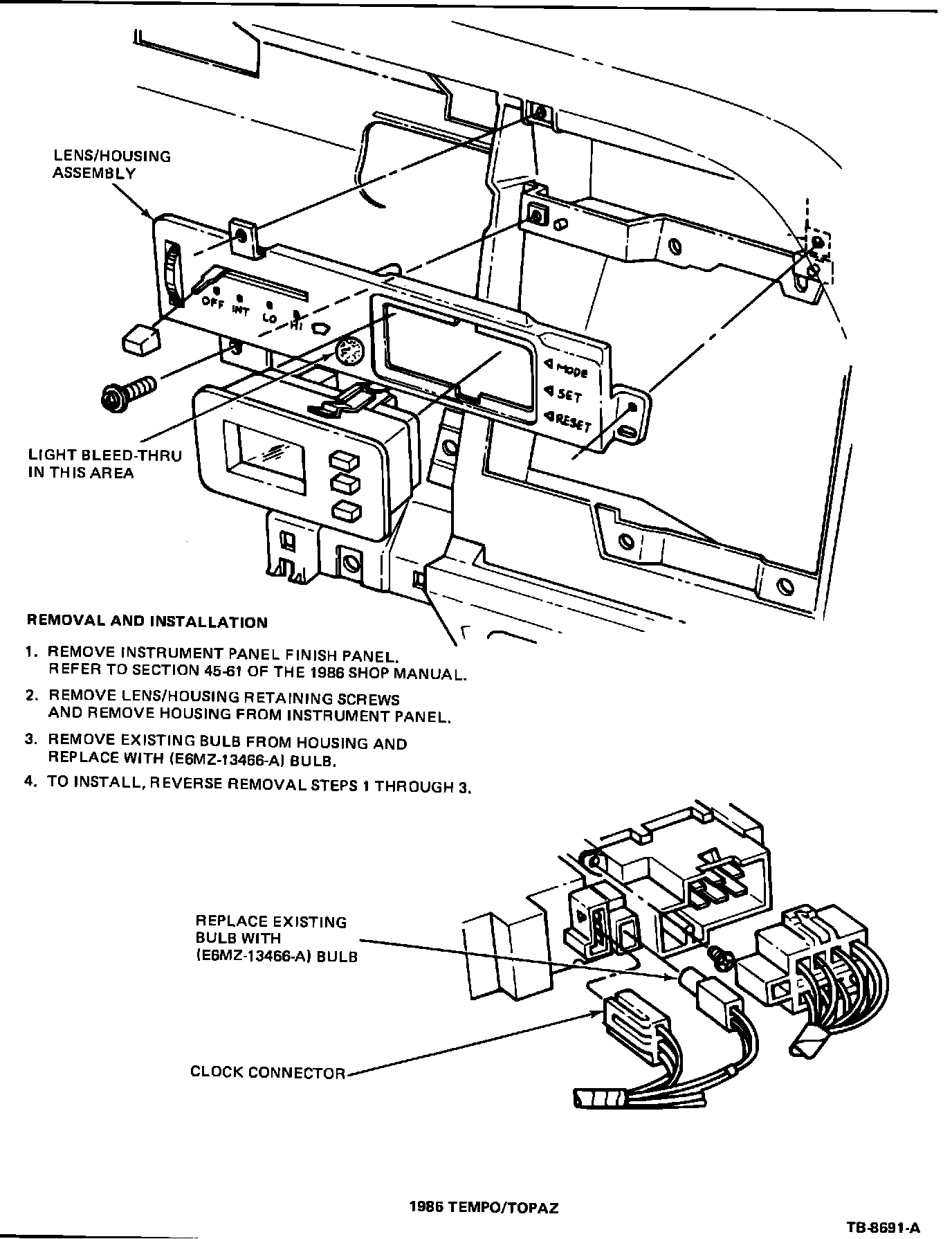The electronic clock may exhibit fading of the clock display digits and/or light bleed-through on the wiper switch lens after one hour of driving with the instrument panel lights on. This is caused by heat build-up from the clock and the bulb for the wiper switch lens. This may be corrected by replacing the wiper switch lens bulb with a (E6MZ-13466-A) bulb. If light bleedthrough is visible at the area shown in Figure 2, the wiper switch lens housing should be replaced. DO NOT replace the clock.