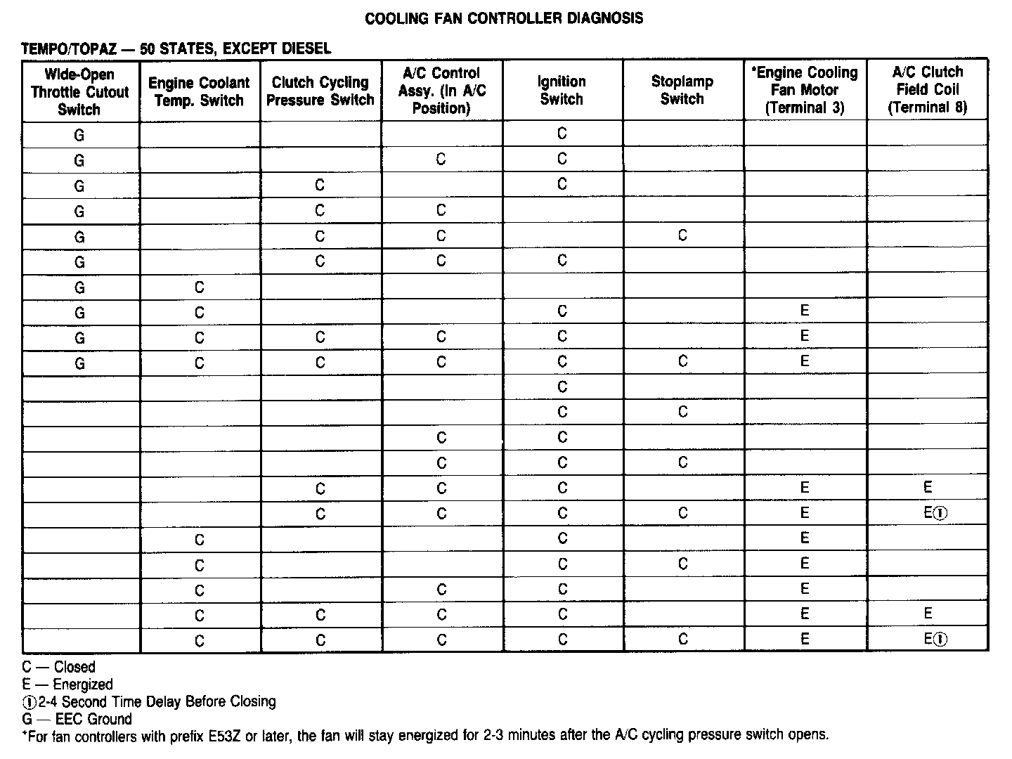 Each cooling fan controller has the part number stamped on the housing or on the mounting bracket to identify the controller. It is important that the correct controller be installed for proper operation. Locate the correct cooling fan controller diagnosis procedure and wiring diagram. Then, determine the position (open or closed) of each switch in the system (listed at top of diagnosis chart). Then, locate the appropriate row of the diagnosis chart to correspond with the switch positions. Follow the row to the right to determine if the letter F appears in that row. An E in the column at the right indicates that the component listed at the top of that column should be energized for the switch positions.