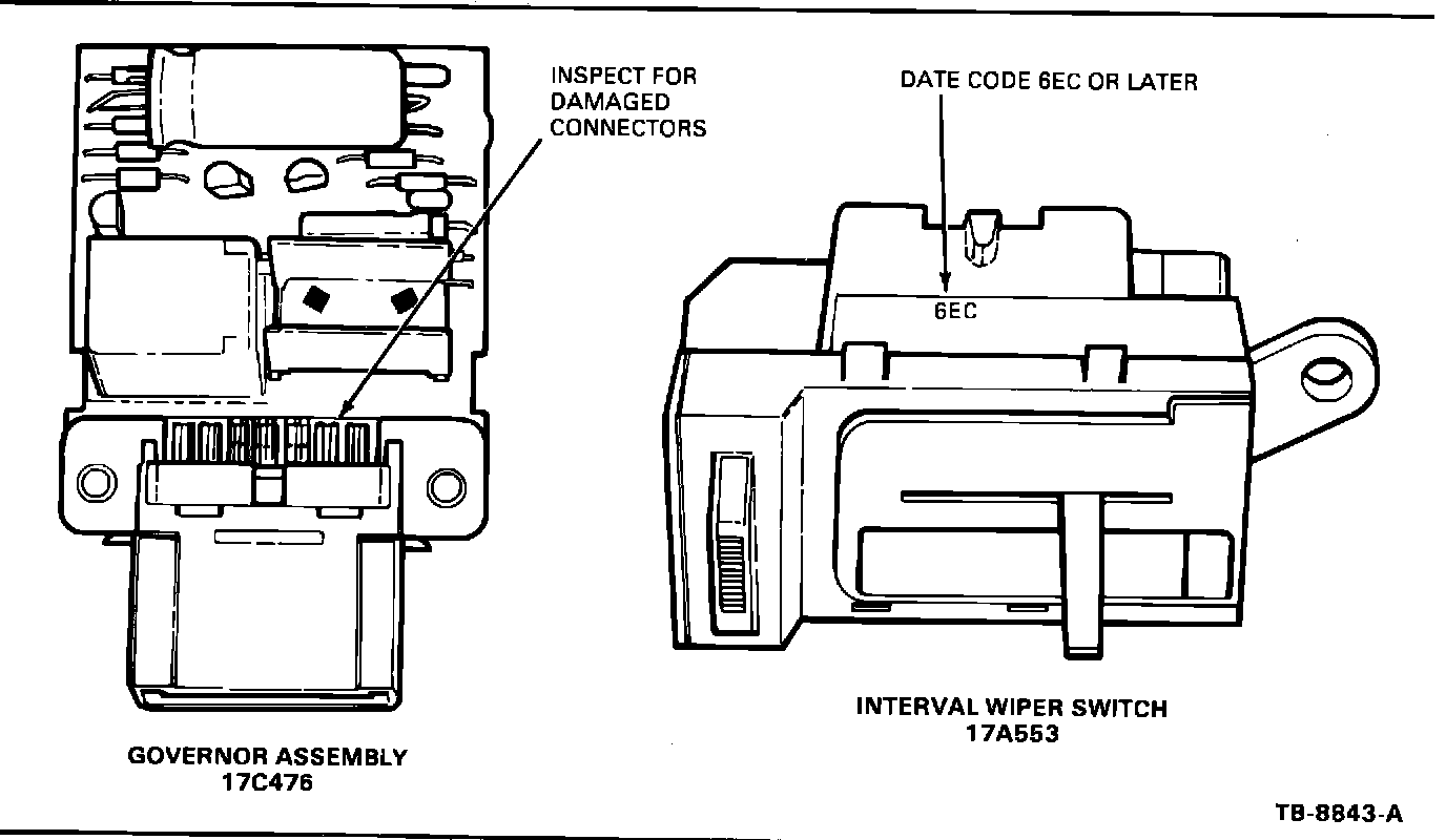 2. Remove the cover from the governor assembly and inspect the connector pins for damage or discoloration, see Figure 8. If either condition is found, replace both the governor assembly (E63Z-17C- 476-A) and the interval wiper switch (E63Z-17A- 553-B). Use the 1986 Shop Manual, Volume C, Section 35-60-33 for interval wiper switch replacement.
