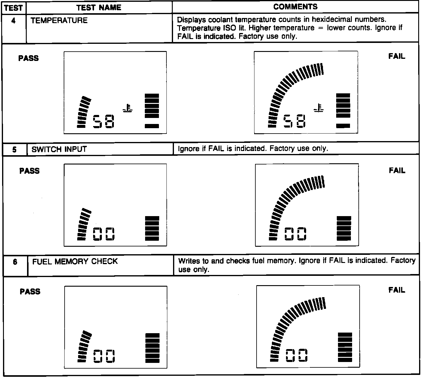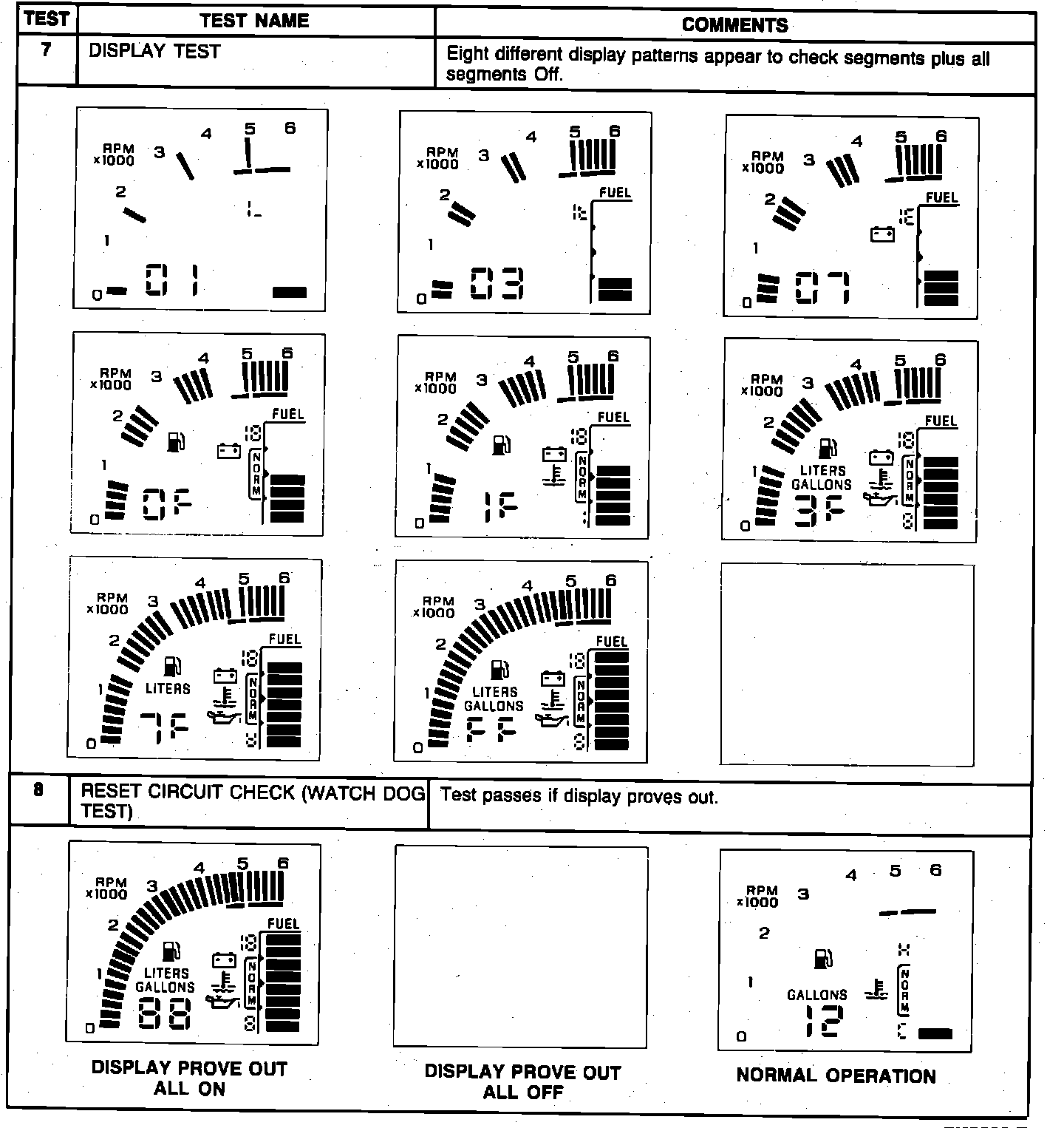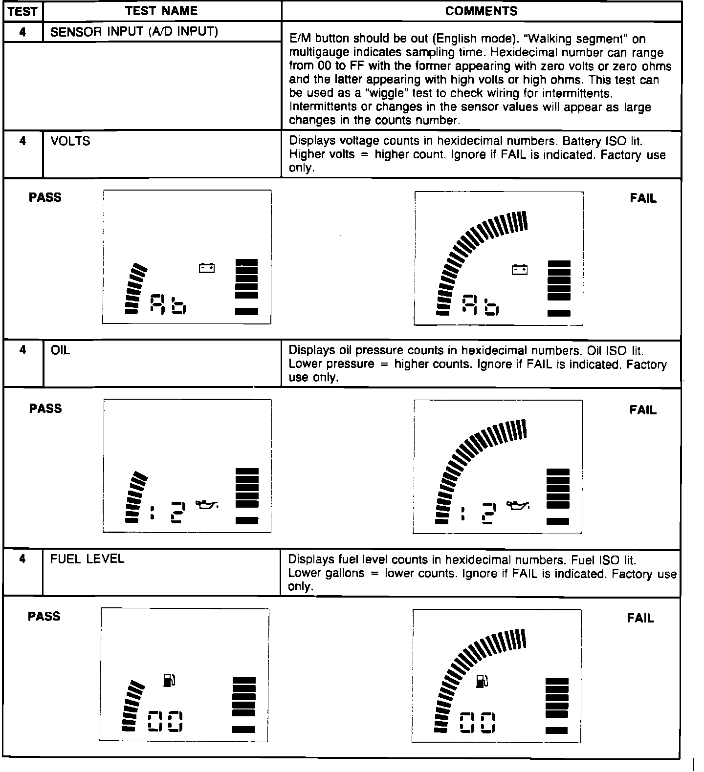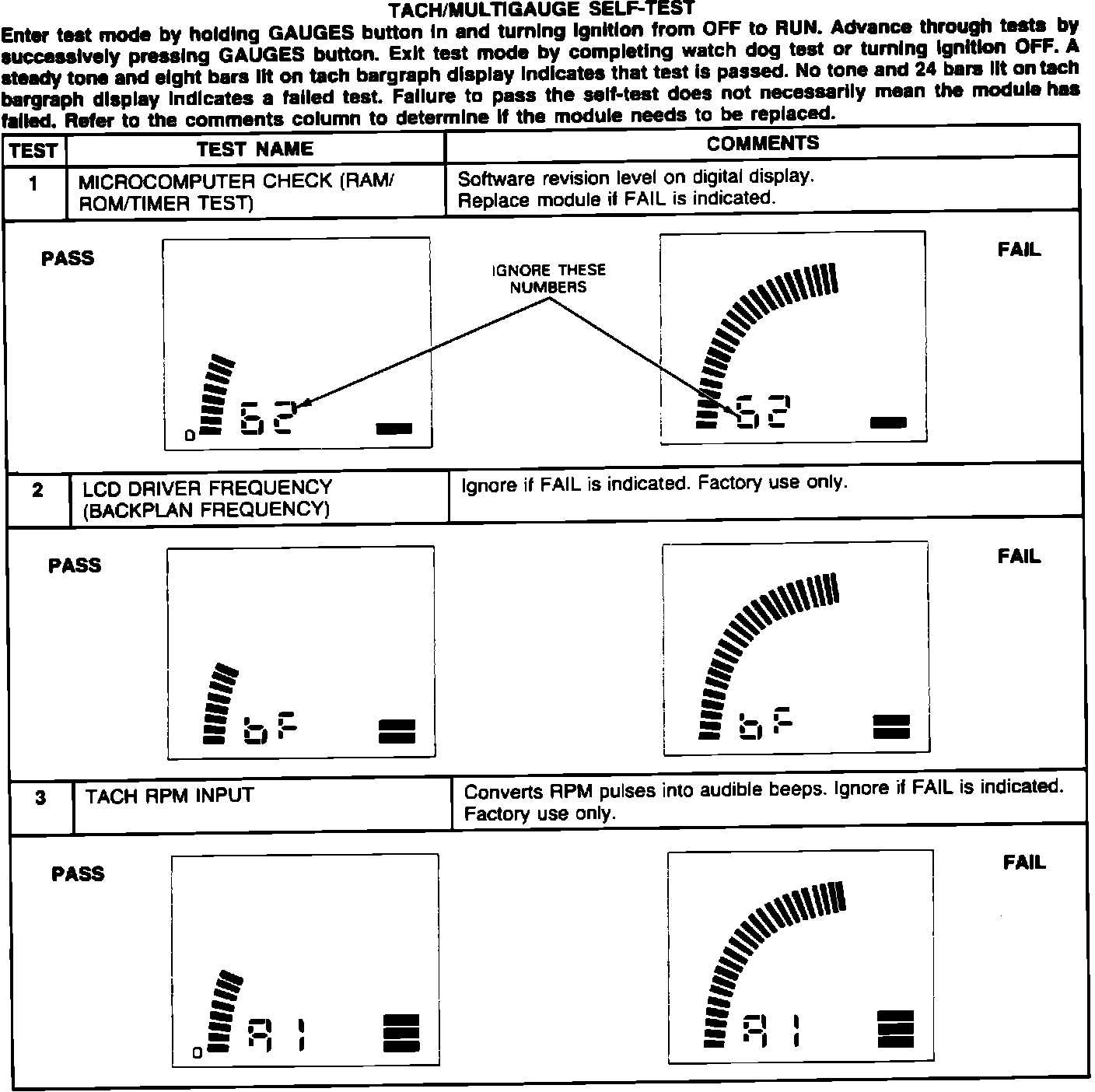 Enter test mode by hoding GAUGES button in and turning ignition from OFF to RUN. Advance through tests by completing watch dog test or turning ignition OFF. A steady tone and eight bars lit on tachometer bar graph display indicates that the test is passed. No tone and 24 bars lit on tachometer bar graph display indicates a failed test. The test number is indicated by the number of bars lit on the multigauge.TEST 1 - 3