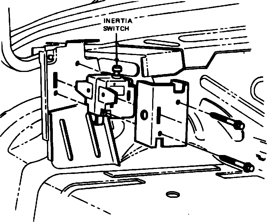 In case of a collision, the inertia switch opens and shuts off the fuel pump even if the engine does not stop running. The engine will stop moments thereafter and cannot be restarted unless the switch is reset manually. On 1984---85 Crown Victoria Wagon and Grand Marquis Wagon the inertia switch is located in the left side storage compartment. On all other models, the inertia switch is located in the luggage compartment, Fig. 6. The inertia switch must not be reset until after the vehicle has been inspected for fuel leaks and the necessary repairs made.
