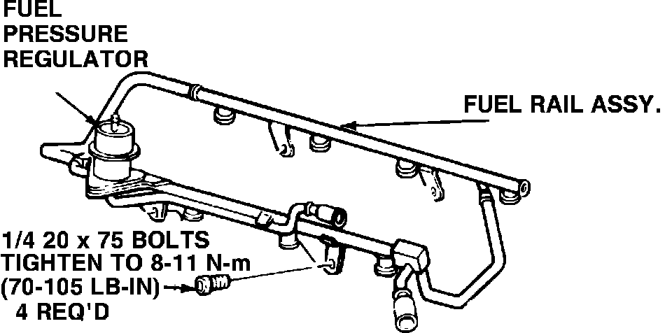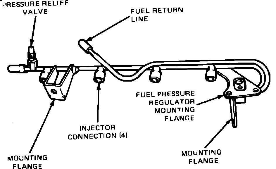 The fuel supply manifold, Fig. 9 delivers high pressure fuel from the fuel supply line to the injectors. The manifold assembly consists of a single preformed tube with either four or eight injector connectors, a fuel pressure regulator mounting flange, a pressure relief valve and mounting attachments. The pressure relief valve is used for diagnostic testing and bleeding of fuel system pressure.