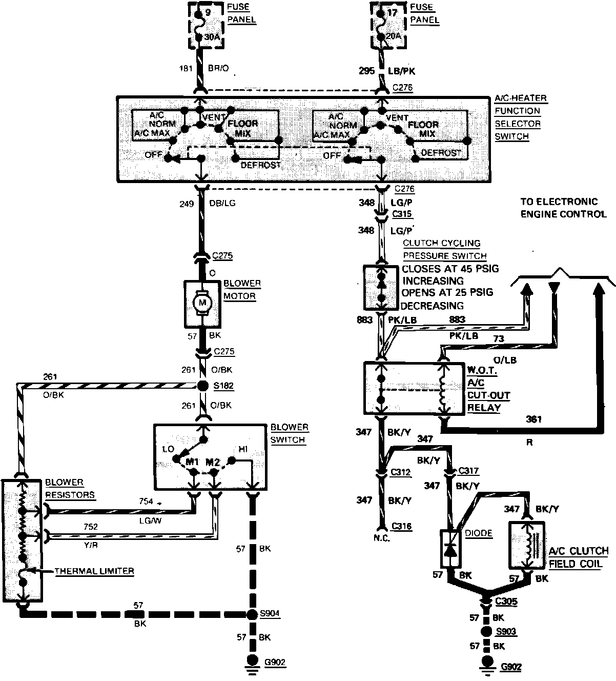 Fig. 5 Air Conditioning & Heater Wiring Circuit. With Manual Air Conditioning & V8-302/5.0L Engine: