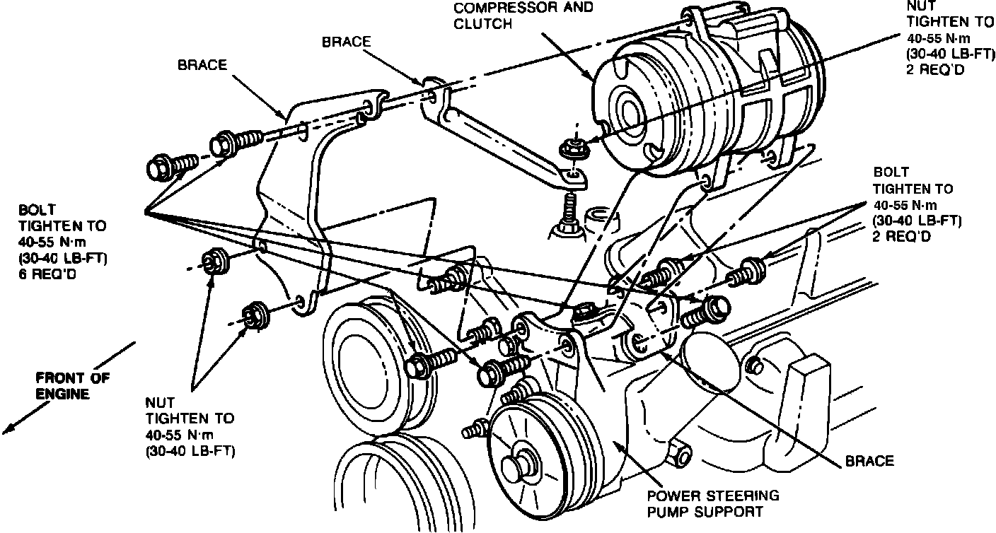 5. Remove two bolts securing rear compressor brace to power steering pump support.