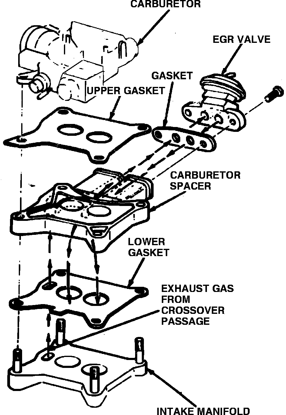 In this system the exhaust gases are metered through the EGR valve to a passage in the carburetor spacer thereby diluting the air fuel mixture entering the combustion chambers. Dilution of the incoming mixture lowers peak flame temperatures during combustion and thus limits the formation of nitrogen oxides (NOx).