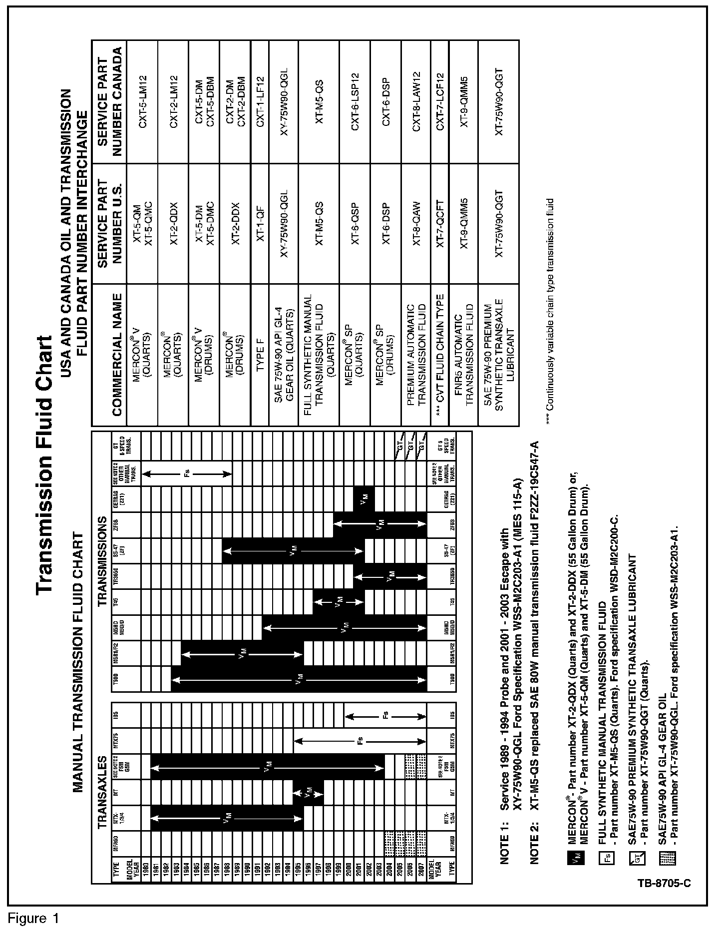 Service manual transmissions requiring MERCON(R) with MERCON(R) V or MERCON(R) Automatic Transmission Fluid or dual usage fluids labeled MERCON/MERCON(R) V. For proper fluid application on current and past model manual transmissions refer to the fluid usage chart. (Figure 1)