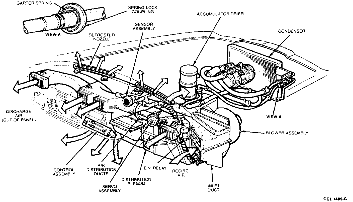 The system utilizes what is called a reheat method to provide conditioned air to the vehicle interior. With this method all airflow from the blower passes through the evaporator core, where it is cooled and dehumidified. Temperature is then regulated by reheating a portion of the cooled dry air and blending it with the remaining cool air to the desired temperature. Temperature blending is automatically varied by the temperature blend door which controls the amount of cooled air that flows through or around the heater core where it is mixed and directed into the distribution plenum. The air is finally directed to the heater ducts the defroster nozzles, or the instrument panel registers according to the selected function lever position.