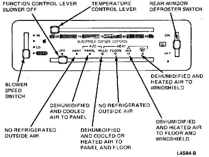 Automatic control of the passenger compartment temperature is maintained in all function control settings shown, except when the system is turned Off. In hot weather, it will cool the vehicle to the preset comfort level and then modulate cooling or heating to whatever is required to maintain the desired temperature. In cold weather, provision is made in the FLOOR position of the function lever to delay the operation of the system until engine coolant has warmed enough to minimize the discharge of cold air from the heater outlet. The system will then heat the vehicle to the desired temperature and level out to maintain the preset temperature.