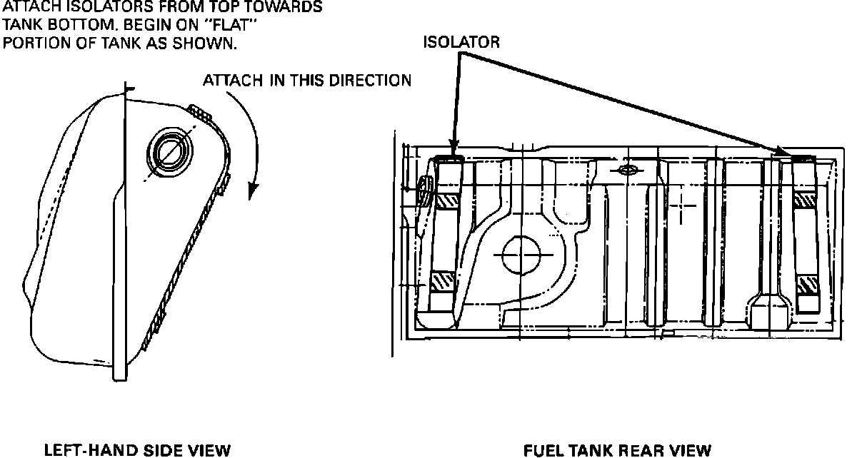 5. Attach the two (2) rubber isolators contained in the kit to the side of the fuel tank that faces toward the vehicle underbody, Figure 1.