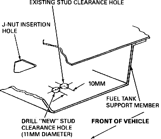 6. Drill an 11 mm diameter hole in each fuel tank support member as follows: