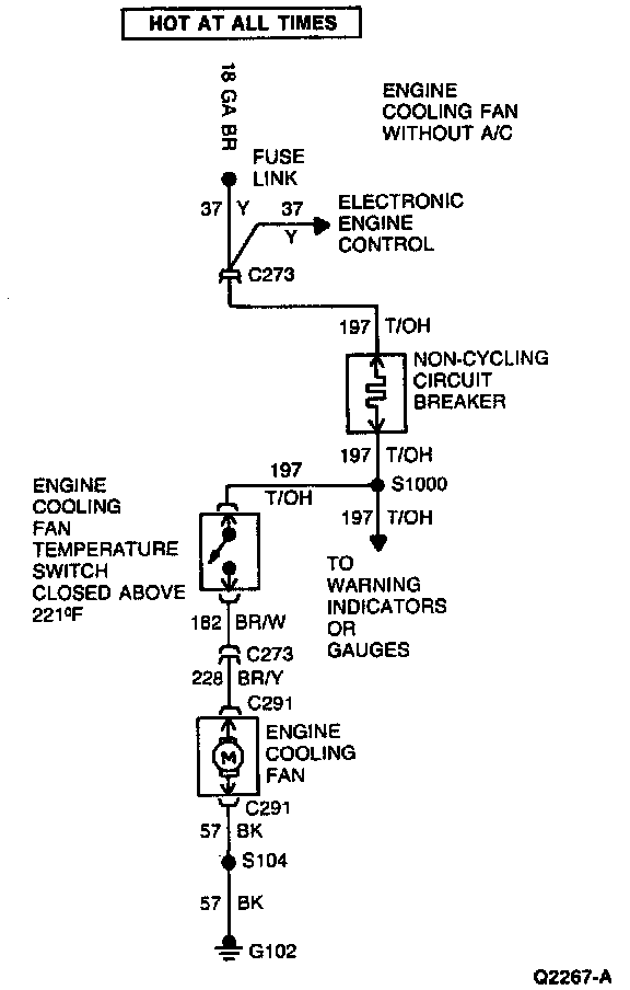 4. Disconnect connector at fan motor and check for voltage on circuit 228 (BR/V). With cooling fan temperature switch connector jumpered, circuit 228 (BR/V) should have battery voltage.