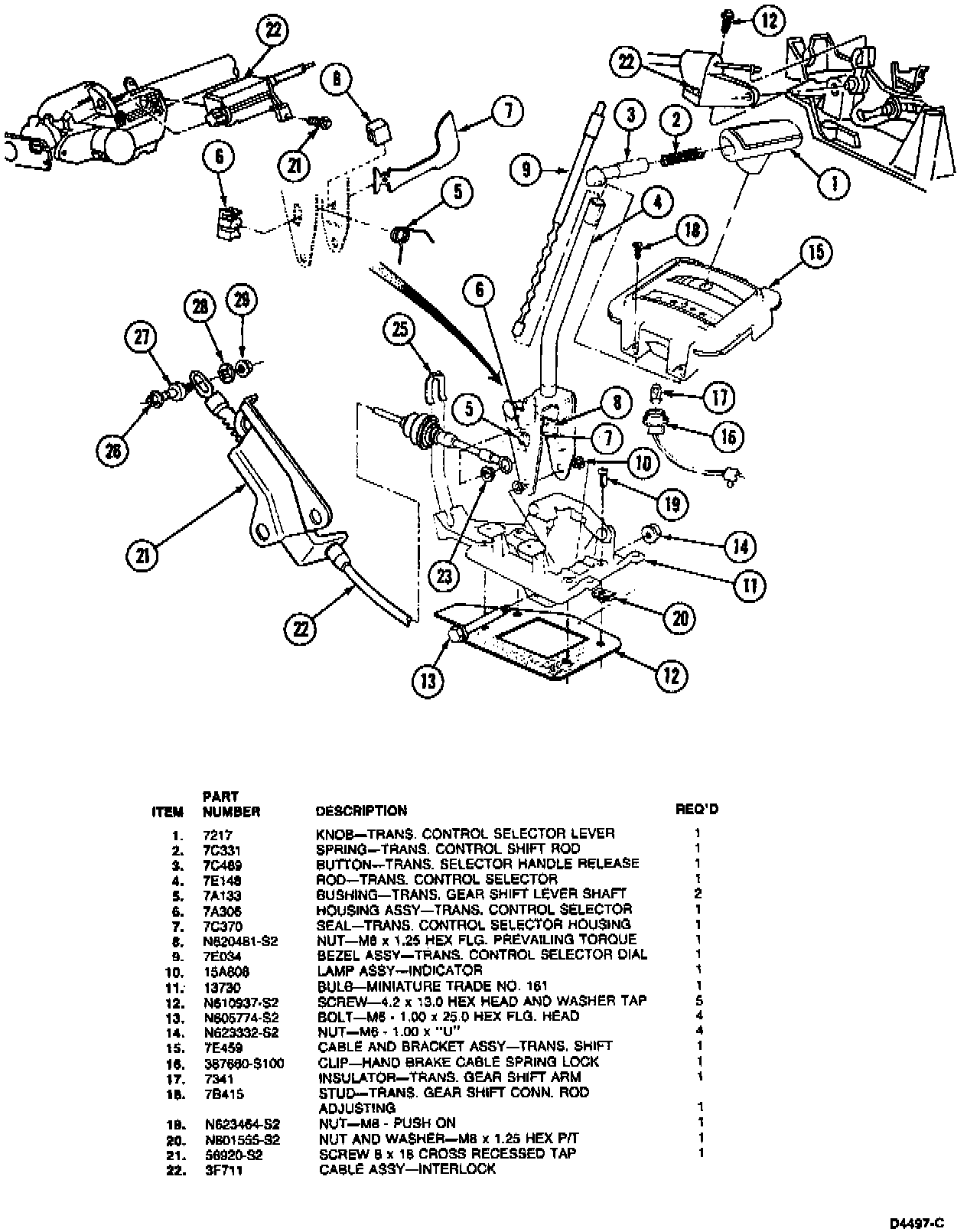 1. Remove shift knob by pulling upward. Remove console and bezel assembly. Disconnect control cable assembly from selector lever and housing assemblies.
