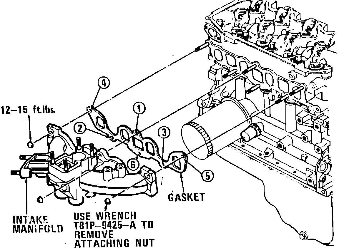 6. Remove bottom three intake manifold attaching nuts, then lower vehicle.