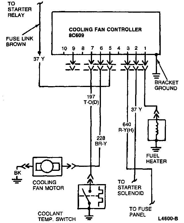 4. Disconnect connector at fan motor and check for voltage on circuit 228 (BR/V). With cooling fan temperature switch connector jumpered, circuit 228 (BR/V) should have battery voltage.