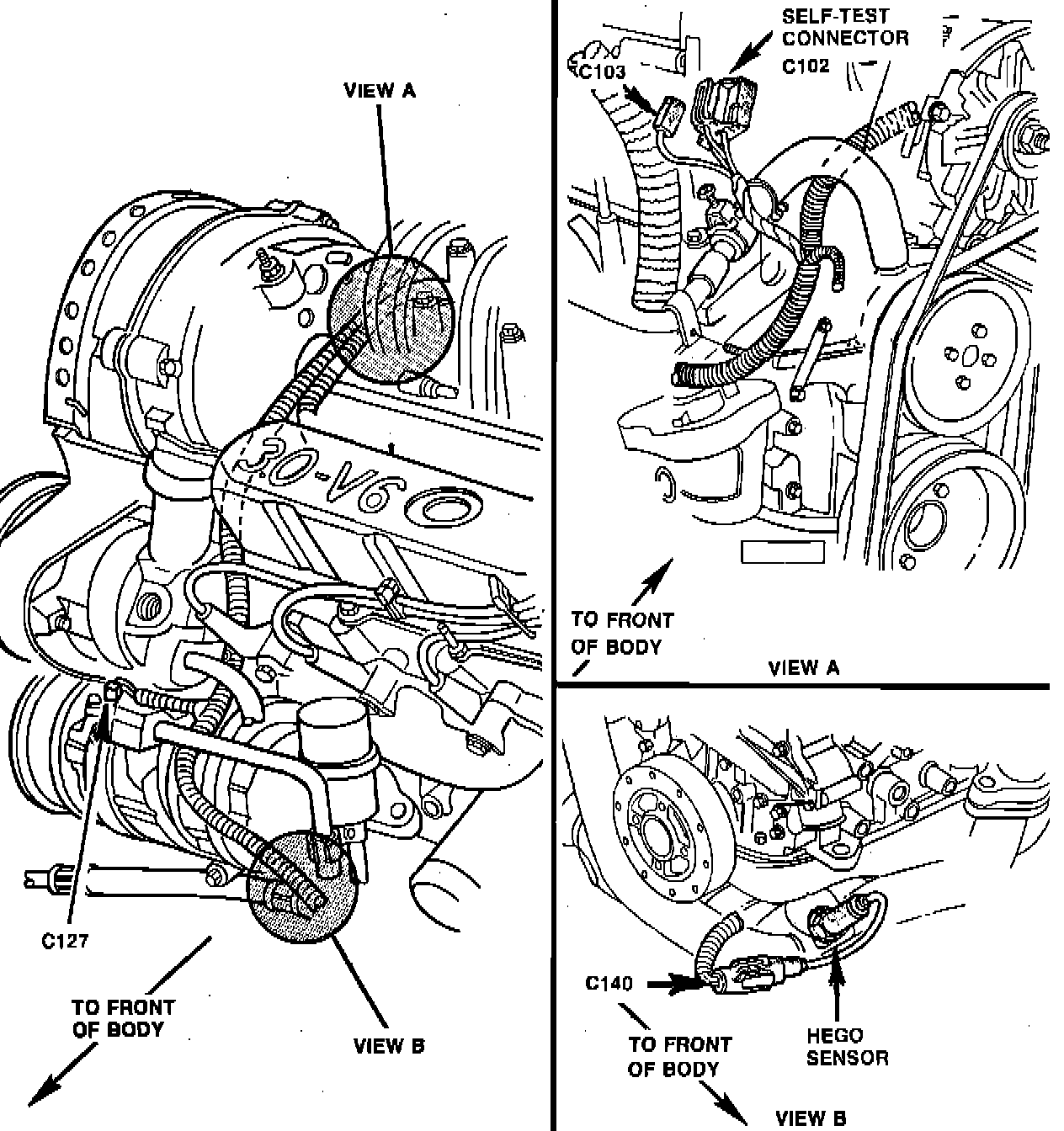 The Vehicle VIP Self-Test Input (STI) and Output (STO) Connectors C103 and C102 are located at the Right Hand Rear of the Engine Compartment.