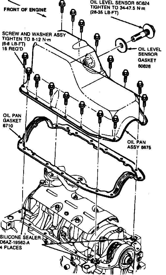b. Torque oil pan bolts to 71---106 inch lbs. and low oil level sensor (if equipped) to 26---35 ft. lbs.