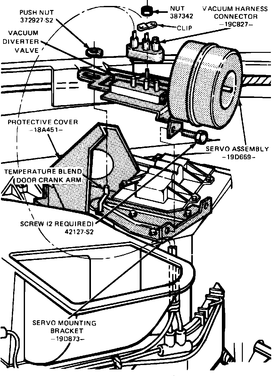 7. Remove push nut retaining servo motor overtravel spring and link to blend door crank arm, and remove servo assembly from vehicle.