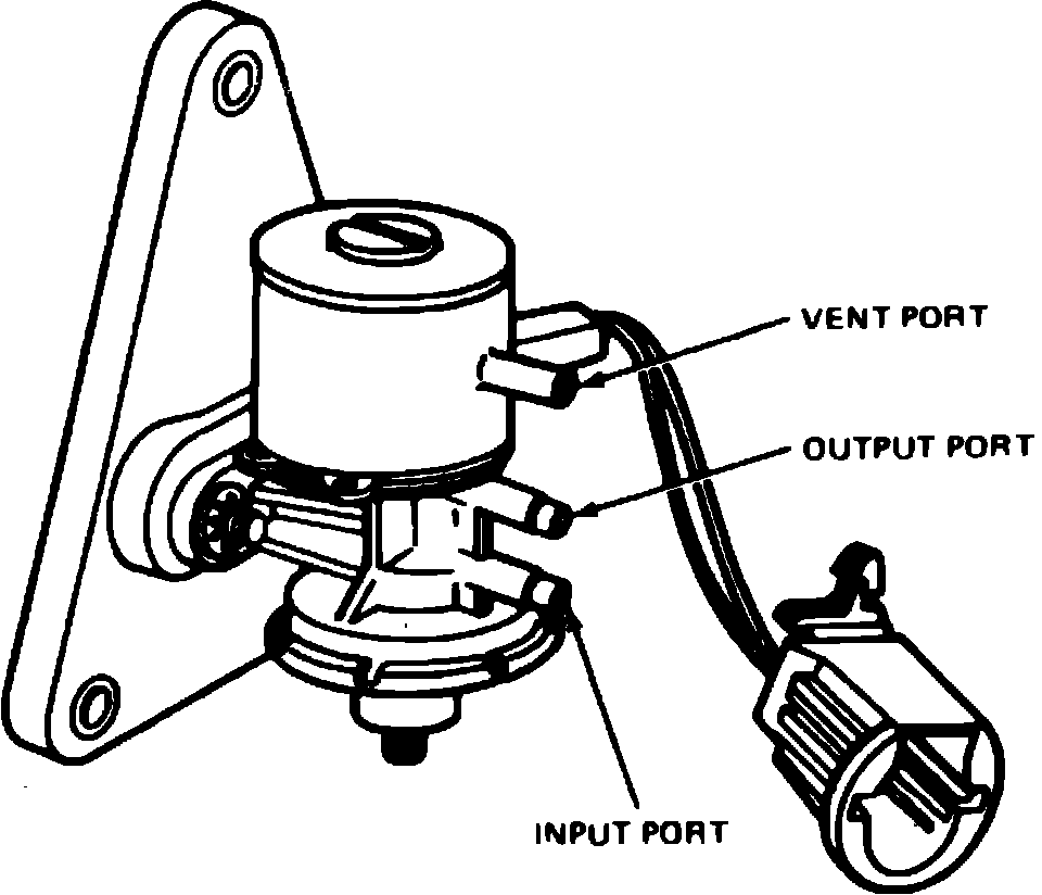 This regulator, Fig. 27, is used to control vacuum to the 6500 feedback carburetor on 2.3 liter engines. During engine operation, the manifold vacuum signal is reduced to a variable vacuum output signal. The vacuum output signal is varied in response to an electric input from the MCU module. The vacuum signal from the vacuum regulator/solenoid varies the air fuel ratio in the carburetor.