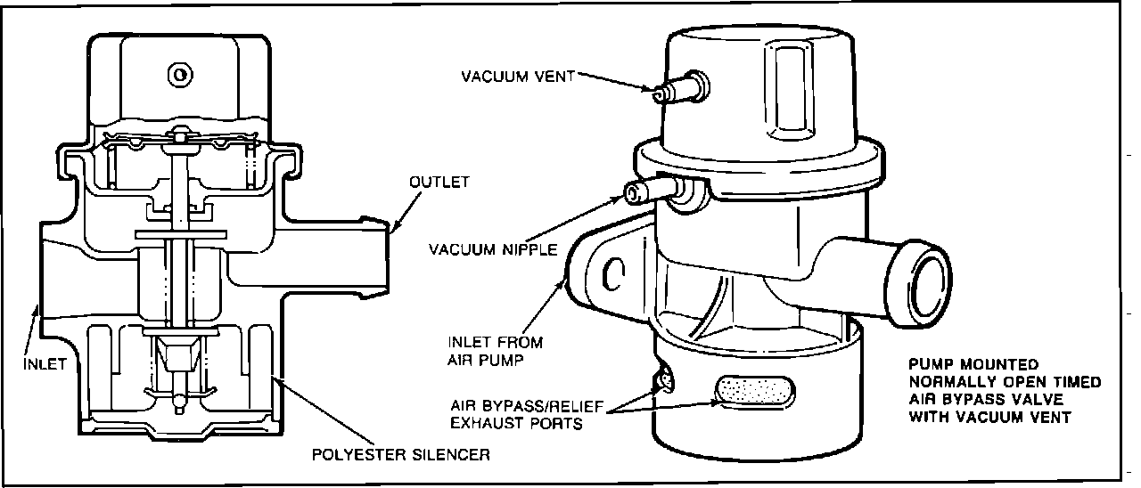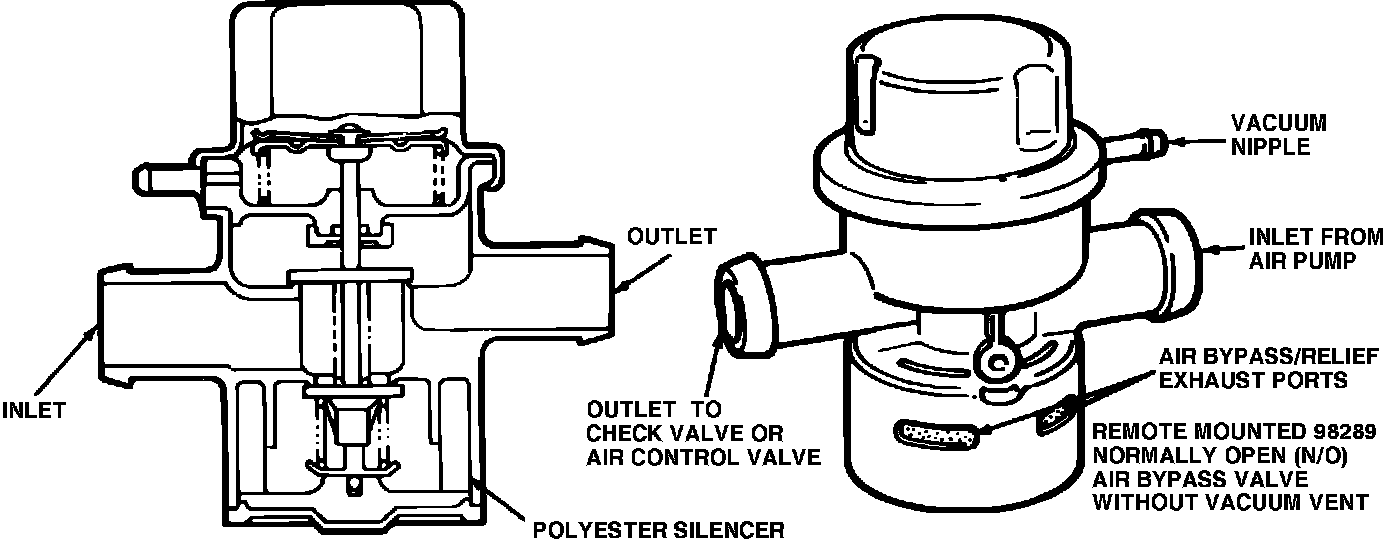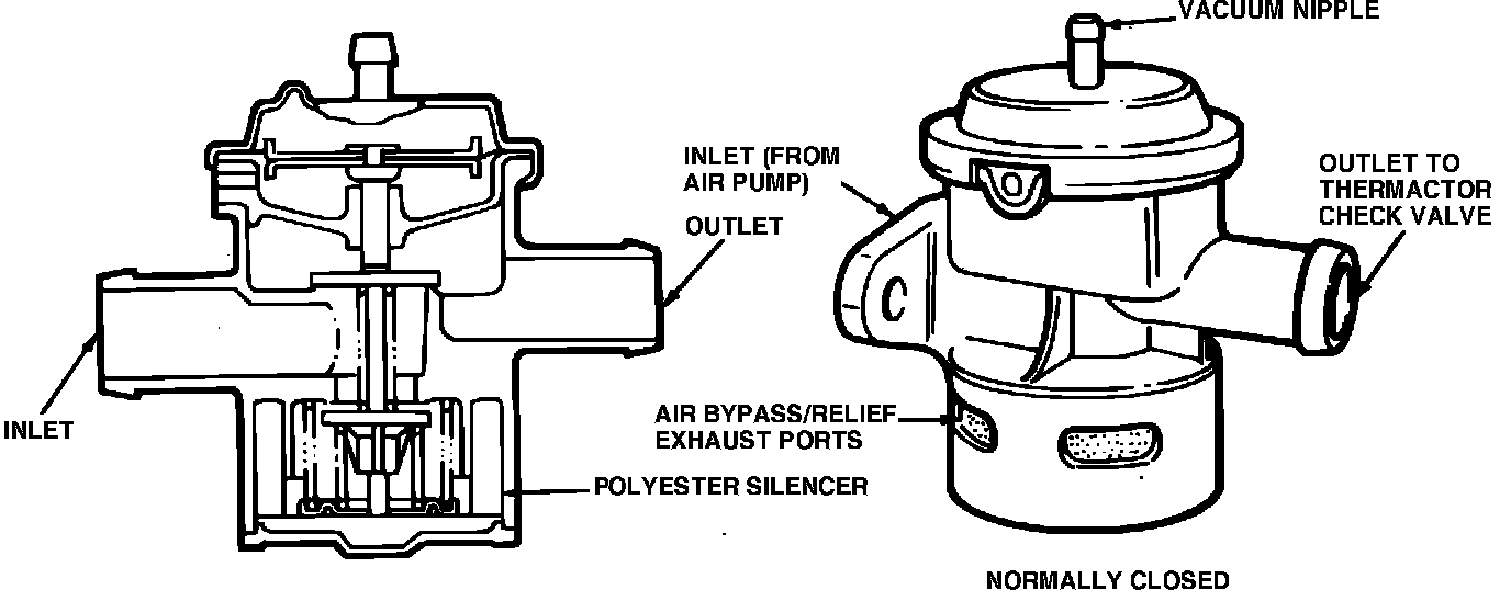 Normally closed valves, Fig. 57, supply air to the exhaust system with medium and high applied vacuum signals during normal modes (engine operating at normal operating temperature), short idles, and some accelerations. With low or no vacuum applied to pump, air is dumped through silencer ports of valve.