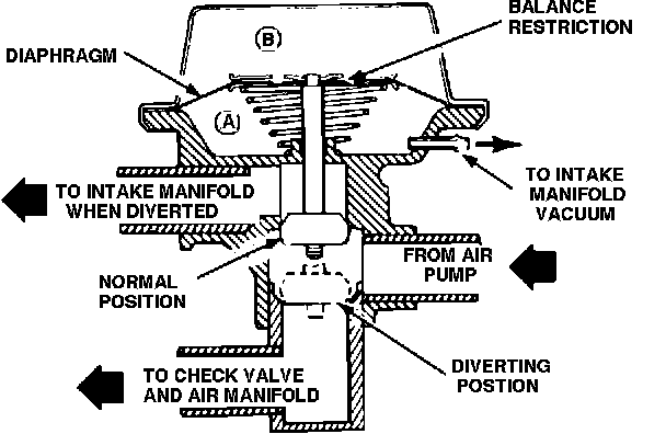 BYPASS VALVE (BPV) - (1) Valve that opens under certain conditions to permit a flow of liquid or gas by some alternate to its normal route. These are bypass valves in oil filters, air systems and power steering pumps. (2) A vacuum controlled valve in the Thermactor system which allows air from the air pump to be injected into the exhaust system or bypassed to atmosphere when not required. It also provides a pressure relief function to protect the air pump from high pressures. These valves may be mounted on the air pump (pump mounted) or mounted in the thermactor hose line (remote mounted). The two basic types are: normally closed (bypasses air with no vacuum signal applied), and normally open (allows air to flow through the valve to the exhaust system with no vacuum signal applied).