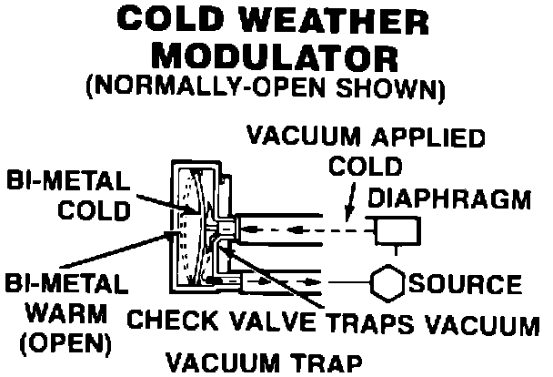 COLD WEATHER MODULATOR (CWM) - A vacuum modulator located in the carburetor air cleaner on some models. Prevents the air cleaner duct door from opening to non-heated intake air when fresh air is below 13~C (55~F). Looks like a Temperature Vacuum Switch, differentiated by color codes.