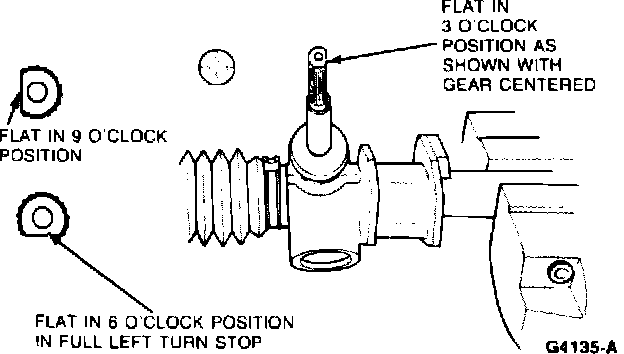 14. Mount gear housing in vise with pinion in approximately in-vehicle position. Hold pinion with flat in 9 o'clock position, Fig. 4, while pushing rack into housing. Jiggle rack to engage rack to pinion and to start rack into rack bushing. Push rack all the way in. The input shaft flat should stop in the 6 o'clock position when the left ball joint contacts the housing (full left turn stop). Repeat the procedures at the load slot, deviating from the 9 o'clock starting position, if necessary, until pinion flat ends up in 6 o'clock position with rack pushed in to full left turn stop.