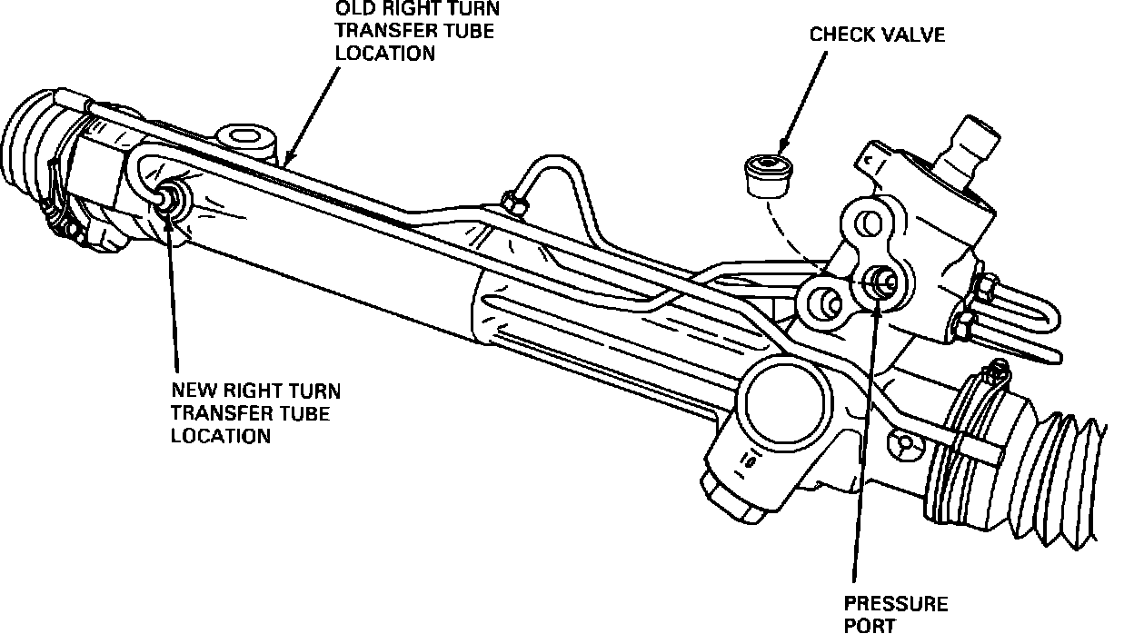 ISSUE: Vehicles built after January 3O, 1987 have had the steering gear check valve relocated to the inside of the pressure port where the power steering pressure line attaches. These steering gears can be identified by the relocated right turn transfer tube and/or the use of the new design hose fittings which do not have serviceable O-rings, Figure 5.