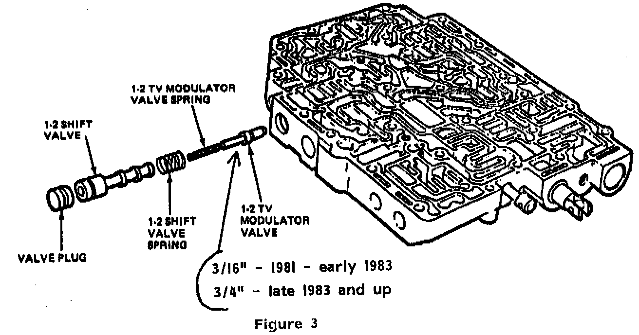 In the valve bodies, the 1-2 shift TV Modulator valve will have a stem 3/16" long. (Figure 3). Install valve body recalibration kit, available at various sources.