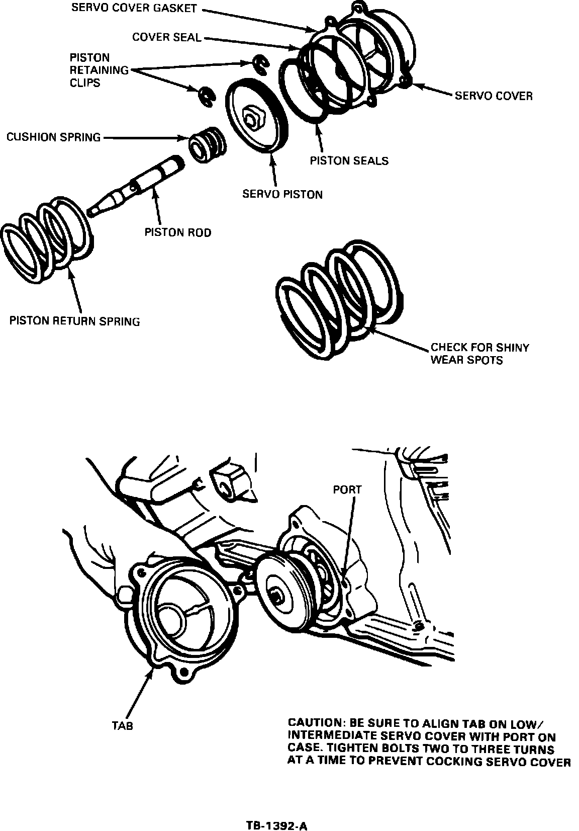 CAUTION: BE SURE TO ALIGN THE TAB ON THE LOW/INTERMEDIATE SERVO COVER WITH THE PORT ON THE CASE, FIGURE 1. TIGHTEN BOLTS TWO-TO-THREE TURNS AT A TIME TO PREVENT COCKING THE SERVO COVER AND PISTON RETURN SPRING.