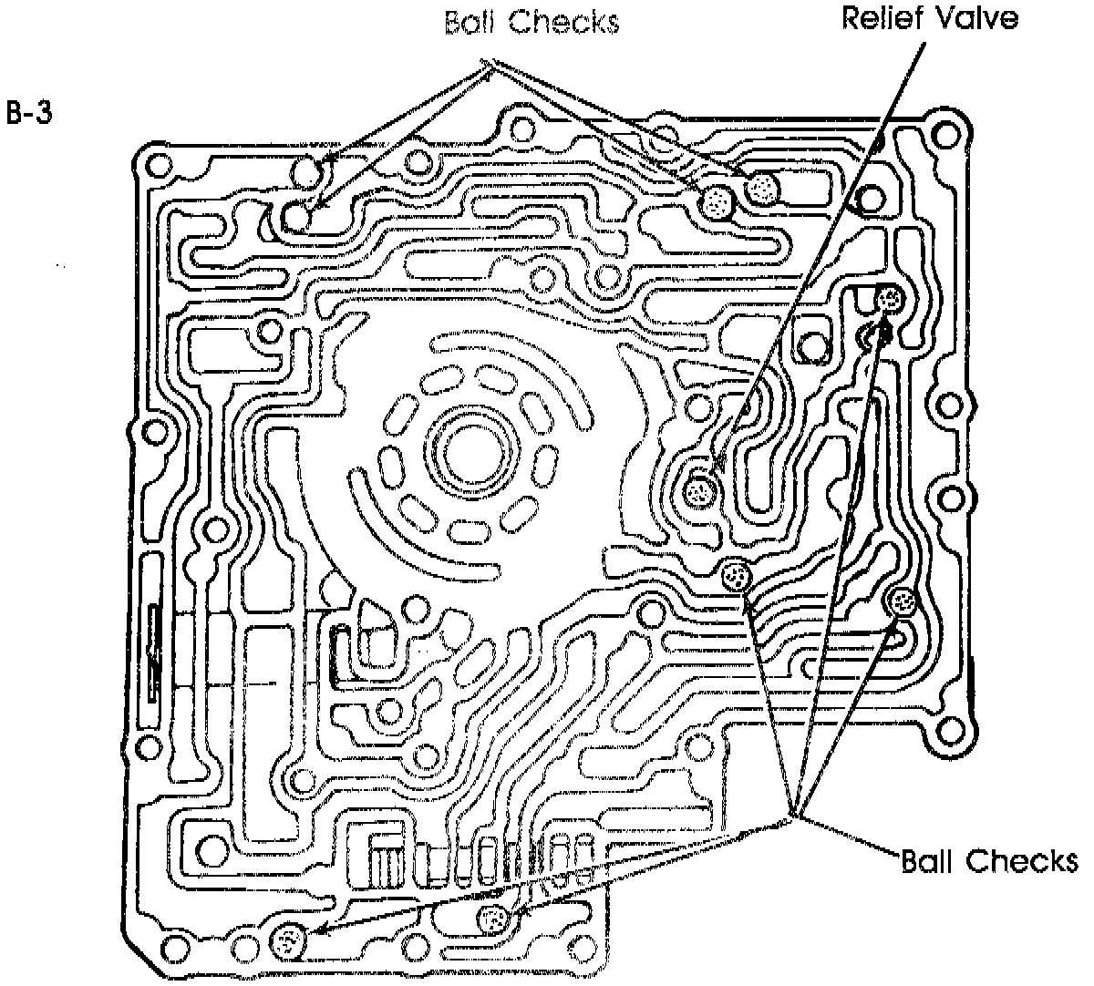A 1-2 bind-up concern can be caused by a missing or leaking "B3" checkball. The "B3" checkball is used to shuffle T.V. pressure and direct clutch pressure (in the manual low range) to be used for pressure regulator boost. A missing (or leaking) "B3" checkball will allow TV. pressure to apply the direct clutch.