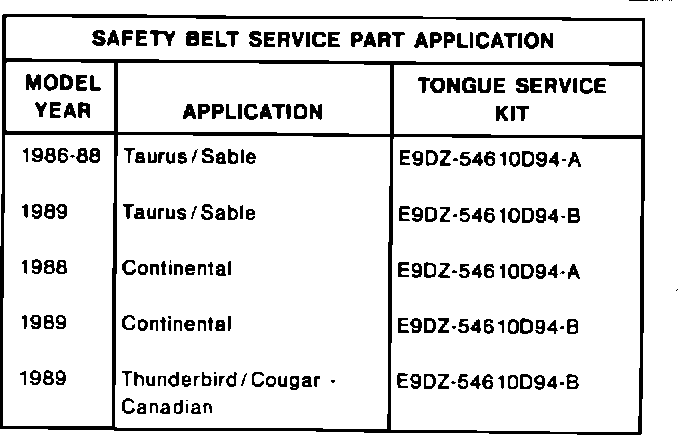 ACTION: If service to the front safety belt outboard tongue is required, use one of the new service kits. Refer to the application chart that follows to determine the correct part usage. Follow the installation instructions provided with the service kit.