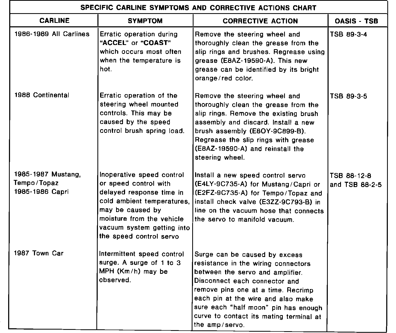 The following charts are a summary of speed control concern symptoms as reported. The corrective action for each is shown, as well as the TSB or OASIS number (if any) as a reference.