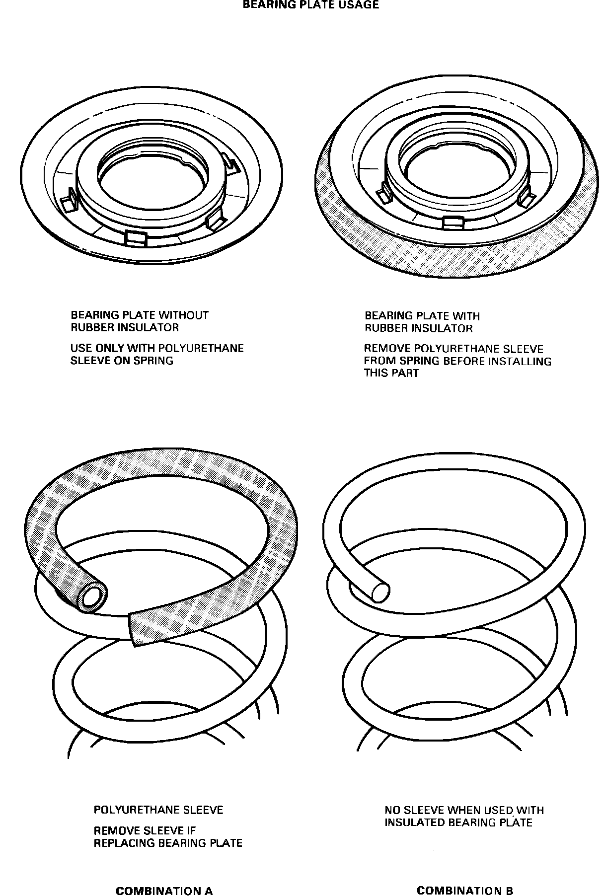 ACTION: If a bearing plate replacement is required in an early 1987 Taurus/Sable with spring and bearing plate "Combination A", it must be changed to a "Combination B" arrangement. To do this, remove the polyurethane sleeve from the upper end of the original spring and install the new service bearing plate with the rubber insulator as shown in "Combination B", Figure 5.