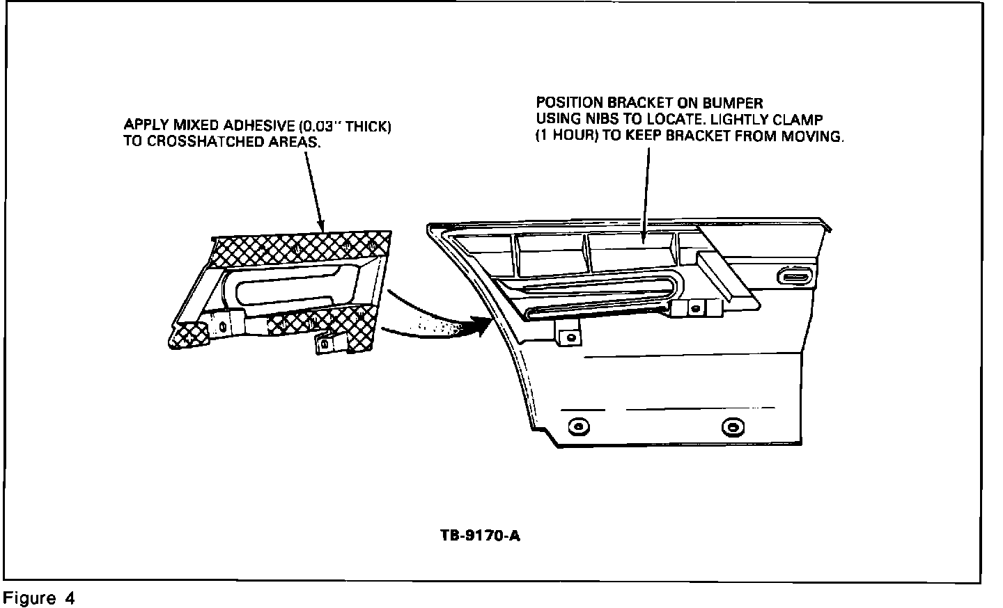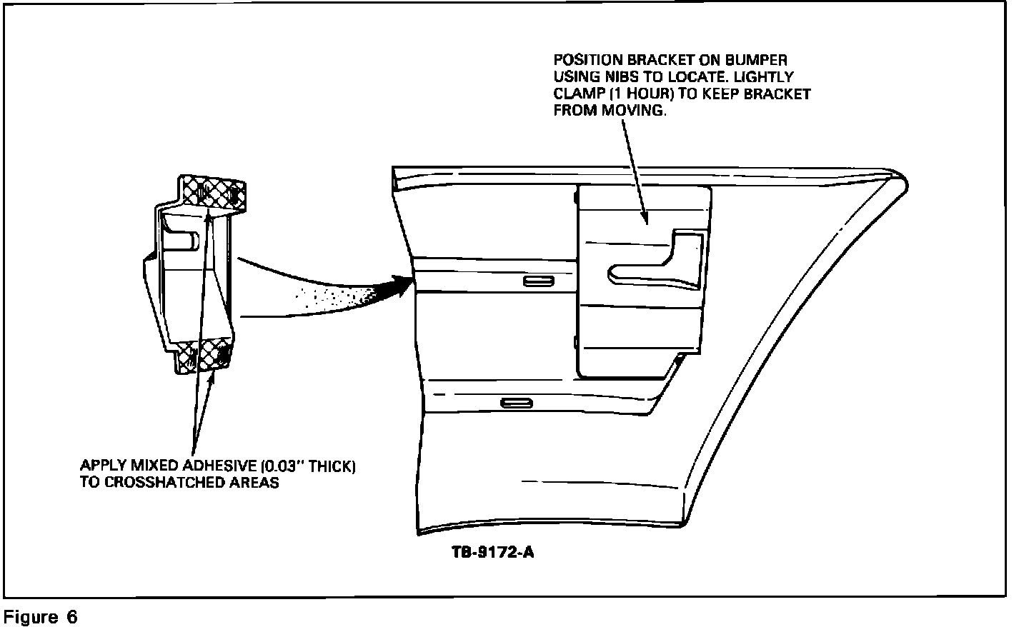 8. Apply mixed adhesive to the mounting bracket flange and install to bumper, Figures 4, 5 and 6.