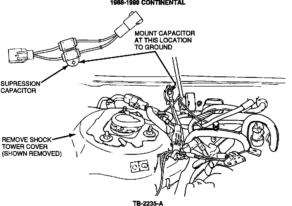 ACTION: Install a radio noise suppression capacitor assembly (F0DZ-18841-A) in series with the heated windshield power feed lines, Figures 1-4. Refer to the following procedure for service details.