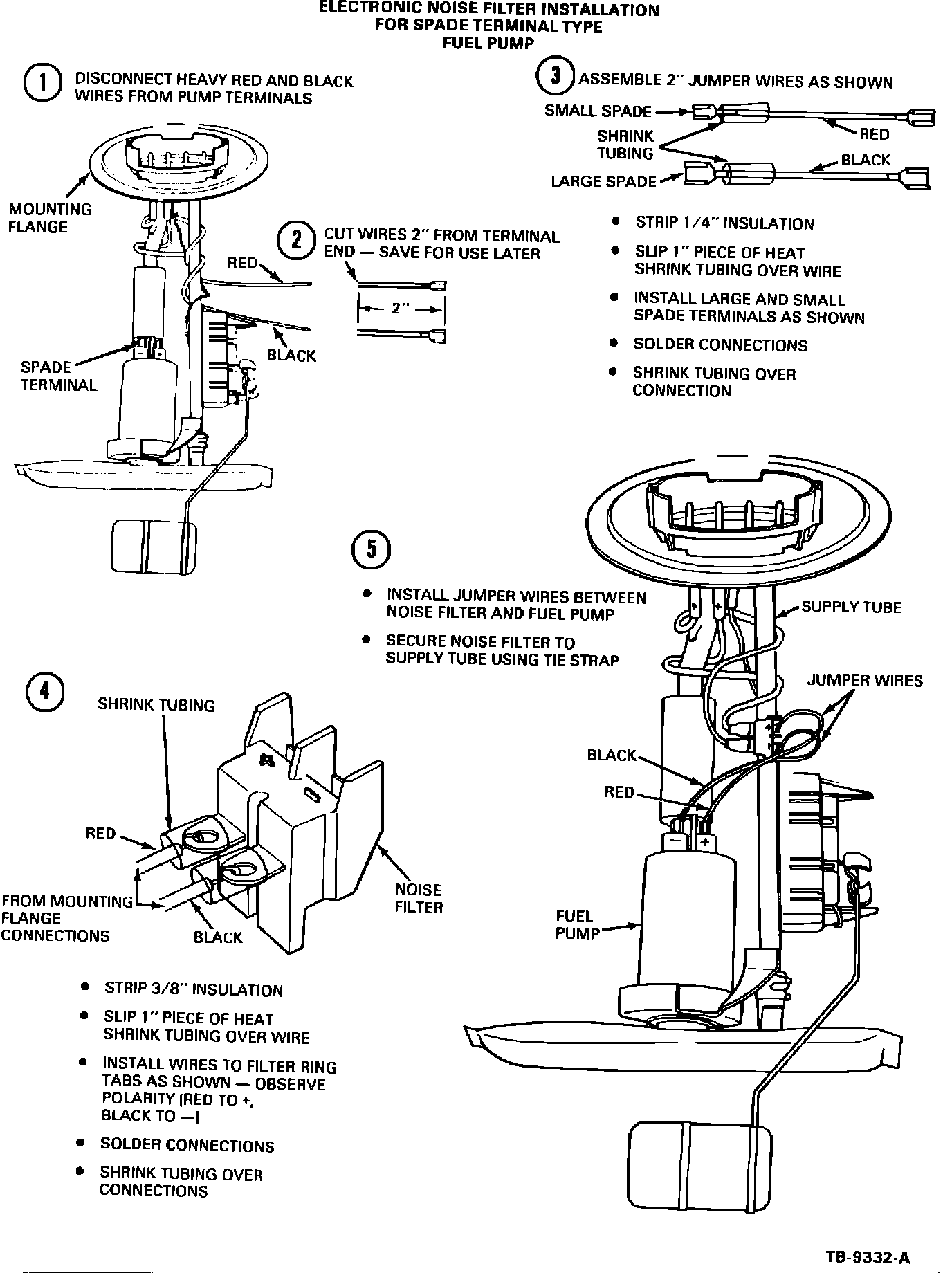 a. Observe polarity marking on fuel pump and RFI noise filter.