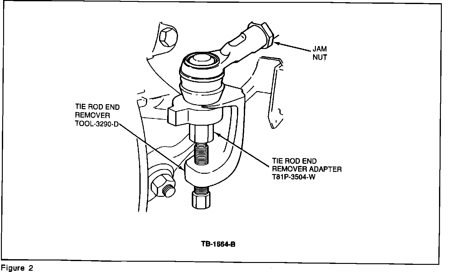 b. Disconnect the outer tie rod from the steering knuckle. Remove the cotter pin and castle nut by using Tie Rod End Remover TOOL-3290-D or equivalent, Figure 2.