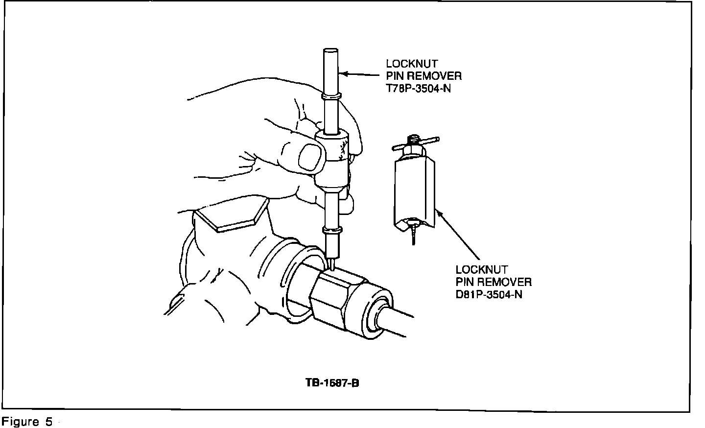 c. Use Locknut Pin Remover D81P-3504-N or equivalent to remove the rollpin, Figure 5. If the rivet is not accessible, unscrew (see Step 6) the inner tie rod until it is accessible (less than 1 full turn).