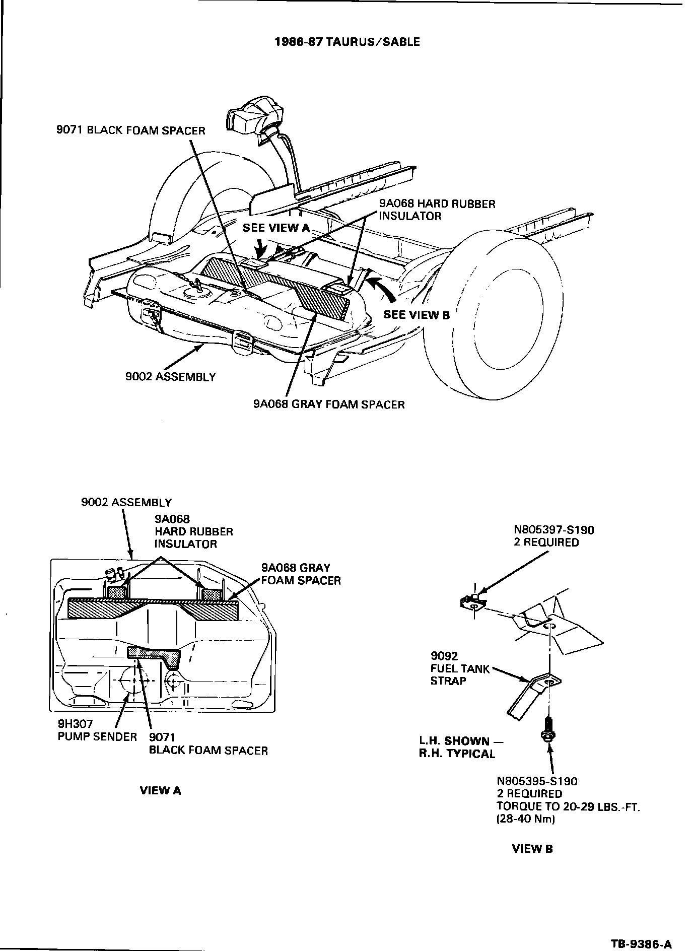 5. Using two (2) new, longer fuel tank strapattaching bolts (N805395-S190) and two (2) new nuts (N805397-S190), first install new left hand fuel tank strap (E7DZ-9092-C). Install right hand fuel tank strap (E7DZ-9092-B). Torque bolts to 20-29 ft.lbs. (28-40 N-m).