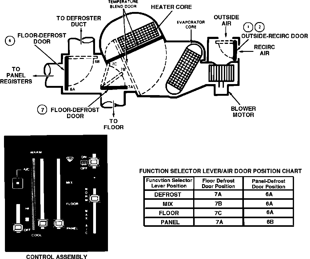 To test A/C heater control system, start engine and move function selector lever slowly from one position to another. A momentary hiss should be heard as the selector lever is moved from one position to another indicating that vacuum is available at the control assembly. A continuous hiss at the control assembly indicates a major leak somewhere in the system. It does not necessarily indicate that the leak is at the control assembly.