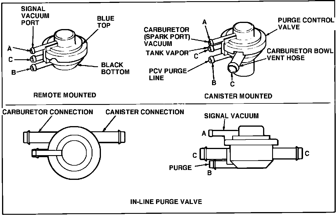1. Ensure that air flows between carburetor port and canister port when no vacuum is applied to vacuum signal nipple.