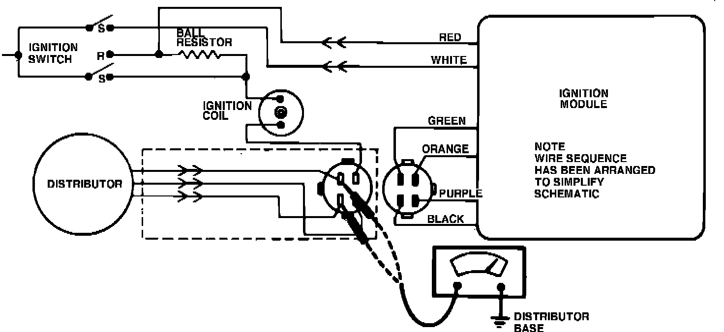 2. Using a suitable ohmmeter, connect one lead to ground at distributor base. Using other lead, alternately measure resistance of harness wiring which connects to orange and purple wires of module connector and ground, Fig. 6.