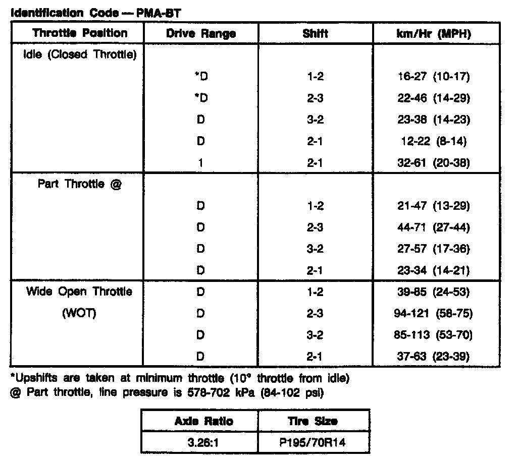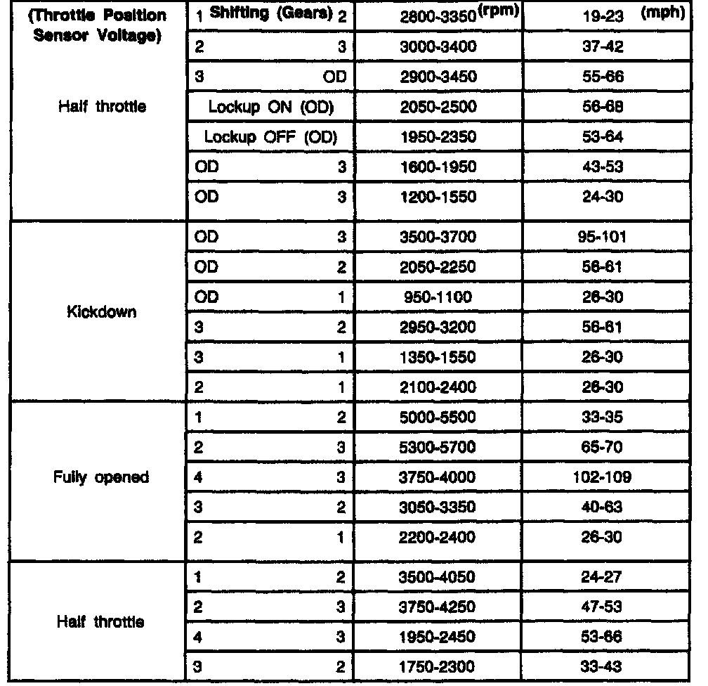 AXOD 4-spd A/T, Shift Speeds (Festiva):